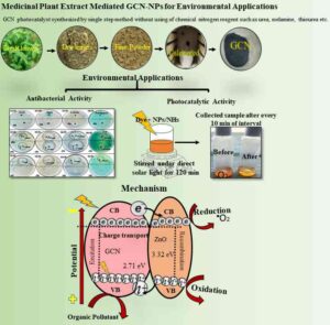 This work enabled the biosynthesis of graphitic carbon nitride nanoparticles (GCN-NPs) without using any chemical reagents like urea. Nanocomposite combining GCN and metaloxide nanoparticles (ZnO and MgO) using the same plant source were also produced and studied. We were able to develop an environmental friendly synthesis that promote circular economy to produce GCN, ZnO-GCN and MgO-GCN nanomaterials and nanocomposites. The study showed that these nanocomposites exhibit very good photocatalytic properties to degrade organic pollutants (still under investigation) and antimicrobial properties.